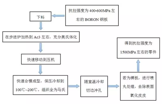 热冲压是先将胚料加热至一定温度,然后用冲压机在相应的模具内进行冲压,以得到所需外形的一种材料成型方法。