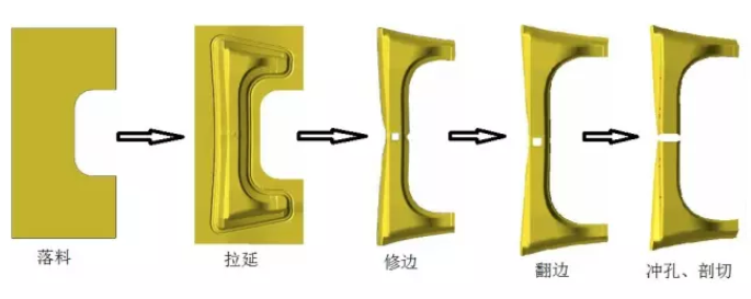 为了方便大家直观理解,下图所示为典型冲压工序: