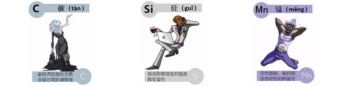 碳是最为经济的强化元素(间隙式溶解或碳化物析出等),它能够提高硬度却不会因此增加多少脆性。但碳含量过高会使钢的耐冲击性下降,也会在焊接(如电弧焊)热影响区产生脆性。硅有助于提高钢在大气中的耐腐蚀性,尤其是酸性腐蚀环境。